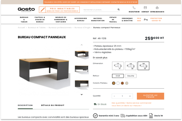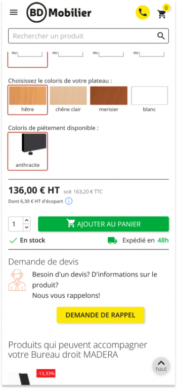 Un site concurrent utilise un système de déclinaisons similaire à celui de BD Mobilier, mais son implémentation permet de mieux exploiter la largeur de l’écran et de limiter le scroll nécessaire pour arriver à l’ajout au panier.