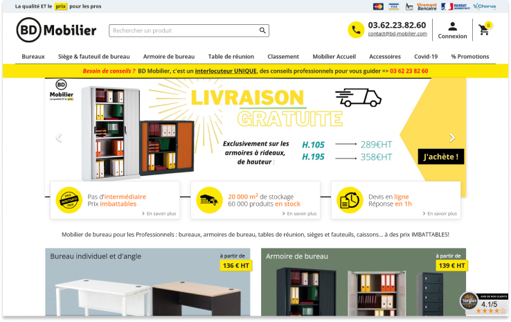 BD Mobilier est un site qui propose un large choix de produits spécialement conçus pour l’aménagement des espaces de travail professionnel. IT-Room a accompagné BD Mobilier dans la migration de Prestashop 1.6 vers Prestashop 1.7, qui a été l’occasion d’une refonte complète du site afin de dynamiser son image