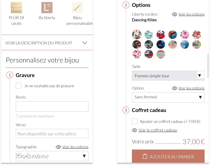 Une attention particulière a été apportée au module de personnalisation : afin de maîtriser les coûts de développement, son fonctionnement n’a pas été modifié, les modifications portent uniquement sur l’ergonomie et la mise en forme. Pour limiter le risque d’abandon en cours de complétion, le module a été divisé en plusieurs petites étapes. Le prix « A partir de » a été supprimé, seul le prix du produit final apparaît et vient conclure le process avec le bouton d’ajout au panier. Étant donné la nature du produit, la décision de supprimer le champ de quantité s’est naturellement imposée.