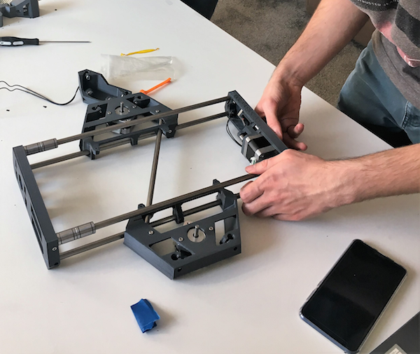 La base de l’imprimante est assemblée, l’équipe s’accorde pour poursuivre demain.